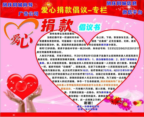 看到这条信息后,笔者继续深入凤庆同城微信公众平台采访,负责人字斌告诉笔者:“这个小朋友的父亲找到我,我在平台上转发他小孩的求助信息,凤庆的爱心人 士看到后,自发的组织起来,我们有6个志愿者,负责收集捐款,每天在平台更新捐款信息。目前,已经收到39210元。”