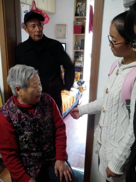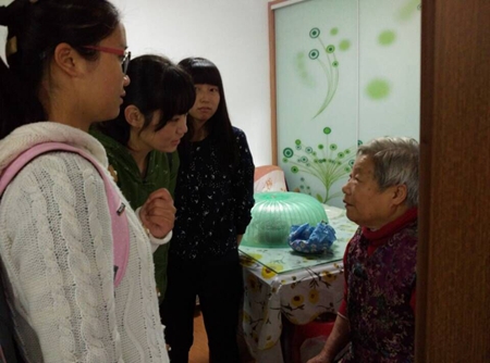 江苏科技大学“三自协会” 和义工站同学们到来到丁丛芳老人家中,高聪给丁奶奶带来了水果,部分志愿者们为老人们带来了自制礼物。