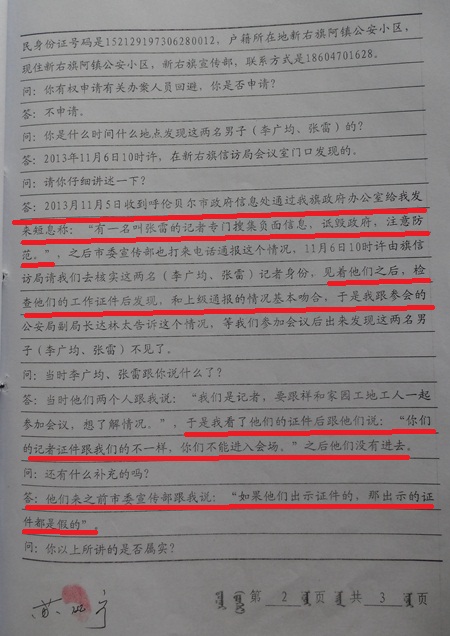 在李、张二人被拘留期间,新右旗宣传部副部长苏风宁,以在新闻出版署记者证查询系统中没有查到二人信息为依据,在网上发文称二人是假记者,并污蔑李没有新 闻从业经历,他还称李所谓的在“新华社吉林记者站”工作的经历纯属虚构。令人感到吃惊的是,这位以真记者自居的宣传部副部长,竟然连新华社的机构设置都不 知道,李从来也没有说过在“新华社吉林记者站”工作过,只是说曾经在新华社吉林分社吉林内参工作过,而这位苏大部长居然编造了一个子虚乌有的机构!
