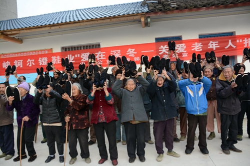 本站讯 (邹厚虎 刘玉和 李亚兵 秦士伟) 12月10日,湖北秭归县九畹溪镇福利院里欢声笑语,暖意融融。由中国公益在线秭归工作站组织开展的爱心企业关爱老年人活动在此盛装开幕,三峡钶尔镫鞋业公司带着浓浓爱意给该院100多名老人捐赠了手工精制的过冬御寒棉鞋,在寒冷冬天给老人们带来了无限温暖。