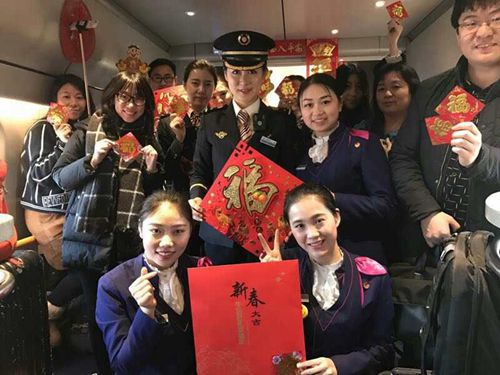 本站讯 2017年1月27日除夕。北京客运段京哈动车车队哈尔滨5.6组,在列车长仇兴楠、周晖的带领下,为乘车旅客送去新春的祝福。列车上精心布置的春联,吊钱,窗花,福字等使列车上年味十足。哈尔滨五组的列车工作人员为车上的小朋友送去了鸡年的吉祥物并与小朋友们合影留念,给大朋友和小朋友们分糖,增加了节日的喜庆和甜蜜;旅客们纷纷拿出手机扫一扫列车上的福字,希望得到五福带来好运。有的扫出了友善福,有的扫出了和谐福!有位幸运的旅客扫出了万能福,旅客高兴的说:今天晚上能分支付宝两亿红包了!感谢你们乘务员带给我的好运气!!!好多旅客要求正值大年三十,大家在车上相遇是缘分!咱们合影留念吧!大家开心的各自拿着福字照相留念!寄语:炮竹声声辞旧岁,欢度佳节福连天,宾朋满座笑开颜,举杯共饮幸福春,百幅福字传祝福,新春快乐合家欢,吉庆有余过大年!京哈动车车队哈尔滨5,6组全体员工祝列车上所有朋友们鸡年春节愉快!(记者张有彭)