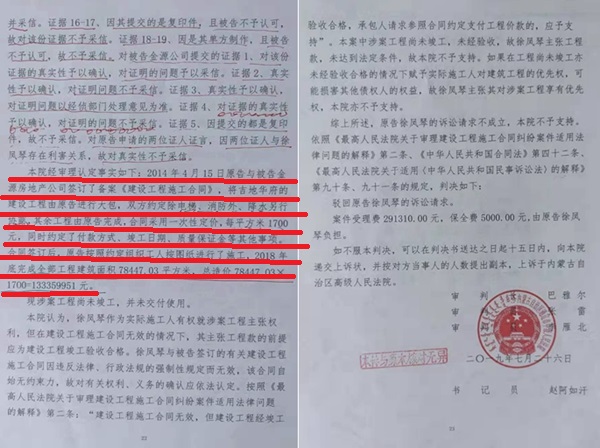 据通辽市中级法院判决书记载:为了讨还工程款,徐凤琴曾就案涉工程多次起诉过国君公司、金源地产和淇奥公司。通辽市中级法院于2019年7月26日作出(2019)内05民初20号民事判决书,明确确认了本案原告徐凤琴作为实际施工人有权就案涉工程主张权利,吉地华府工程造价为每平米1700元人民币,但因被告拒绝提交竣工报告和验收合格证明,她的诉讼请求被法院驳回,又给她造成460970元的经济损失。