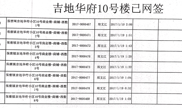 在接受采访时,徐凤琴告诉记者:吉地华府之所以到了今天这种地步,与当地政府的监管严重缺位有直接的关系,就在我们上访、打官司的过程中,有关部门还在帮助对方转移财产。我们从科左中旗政府部门调出来的吉地华府5号、6号、10号楼网签单子清楚的记载着这样的令人不可思议的内幕:政府部门的工作人员晚上甚至半夜还在帮助对方打印单子转移财产!我们曾经就此事问过政府官员,他们居然称是下面的人办的。我们就纳闷了,如果不是上面的领导让这样做的,下面的普通工作人员怎么可能半夜上班打印单子呢?
