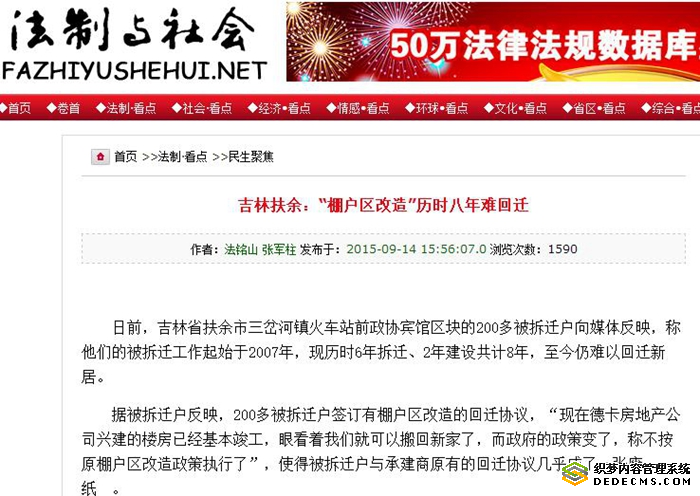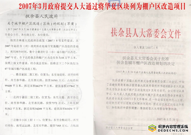 公开资料显示,早在2007年3月30日,扶余县(后改为市)人大通过的“扶余县城市棚户区改造规划的决定”,就已将德卡小区工程即“华夏区块”列为棚户区。同年,扶余市政府将这里列为棚户改造区,即“华夏棚户区”,共28300多平米,300多户,政府承诺第二年年末就能改造完迁回。之后,地产商按照合同要求建起楼房,将拆完房子的270多户居民安置完成,唯独沿街的这趟门市房迟迟拆不动。这趟沿街房有三千多平方,加上后院几处房子和院落,约一万多平方米,共30多户。这三十多户回迁户,一等就是15年之久,而且还不知要等多久!