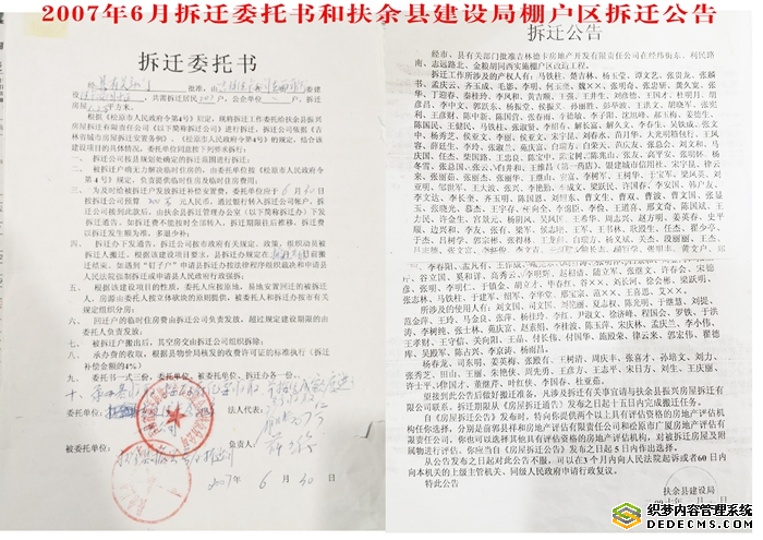 上图左图为2007年6月30日,扶余县政府委托城建局的下属单位振兴房屋拆迁公司承担此次拆迁工程;右图为扶余市建设局棚户区拆迁公告。