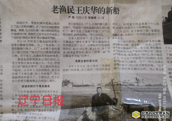 王庆华的这一做法,得到了省市两级民政部门的大力支持,同时他本人也成了当时红极一时的人物。先是《锦州日报》和《锦州晚报》用整个版面报道他及海葬的事,接着《辽宁日报》也用了很大的篇幅来报道他。顺风顺水之时,他先后投入近200万来购专业海葬船,有了政府的支持,他准备在有生之年大干一把。然而,让他没有想到的是,只因主管他的锦州市民政局社会事务处换了领导,一位叫王立新和李军的处长上任之后,老人的命运一下子改变了,到今日已到了倾家荡产的地步。