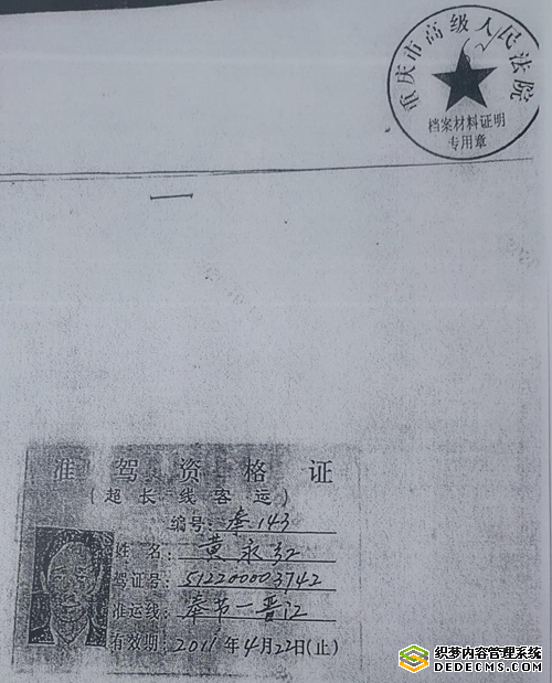 上图:黄永红在重庆万州汽车公司的准驾资格证