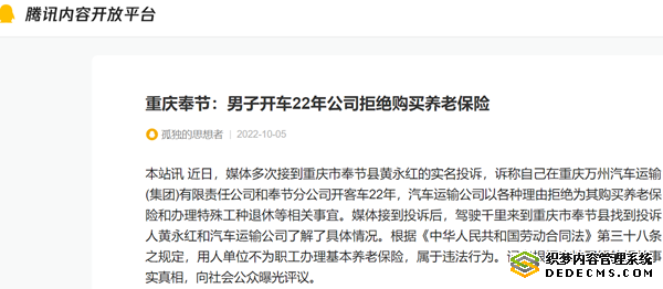 本站讯 近日,媒体多次接到重庆市奉节县黄永红的实名投诉,诉称自己在重庆万州汽车运输(集团)有限责任公司和奉节分公司开客车22年,汽车运输公司以各种理由拒绝为其购买养老保险和办理特殊工种退休等相关事宜。媒体接到投诉后,驾驶千里来到重庆市奉节县找到投诉人黄永红和汽车运输公司了解了具体情况。根据《中华人民共和国劳动合同法》第三十八条之规定,用人单位不为职工办理基本养老保险,属于违法行为。记者根据实地了解的相关事实真相,向社会公众曝光评议。