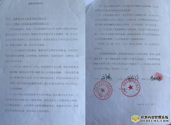 2019年10月28日,六福堂刘总与代先生所在单位签订了《委托代理合同》,合同约定:“一、乙方接受委托,愿意为甲方维护合法权益,在此过程中涉及的专家聘请、法律咨询、资料整理、交通食宿等一切费用,均由乙方自行负责。二、甲方以10040万(一亿零四十五元整)拆迁补偿款为标的物,愿意以其中的20%作为乙方的服务报酬。三、乙方须认真负责保护甲方的合法权益,切实履行代理义务。四、在乙方维权过程中,甲方如与犯罪嫌疑人达成和解,乙方有权要求甲方依本合同约定支付代理费。”