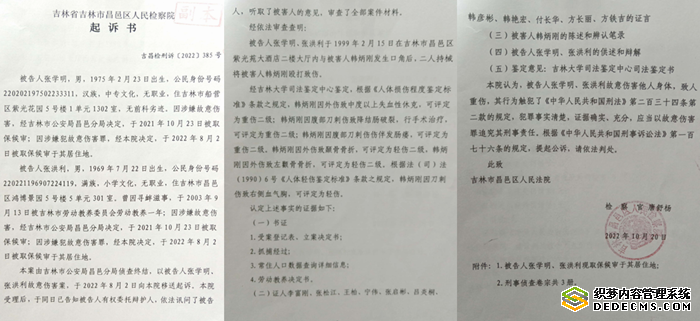 2022年 10月20日,吉林市昌邑区检察院将伤人者张学明、张红利作为被告人移送至法院,从起诉书中可以看到:“被告人张学明、张洪利于1999年2月15日在吉林市昌邑区紫光苑大酒店二楼大厅内与被害人韩炳刚发生口角后,二人持械将被害人韩炳刚殴打致伤。经吉林大学司法鉴定中心鉴定,根据《人体损伤程度鉴定标准》条款之规定,韩炳刚因外伤致中度以上失血性休克,可评定为重伤二级;韩炳刚因腹部刀刺伤致降结肠破裂,行手术治疗,可评定为重伤二级;韩炳刚因腹部刀刺伤伤伴发肠瘘,可评定为重伤二级。韩炳刚因外伤致颞骨骨折,可评定为轻伤二级,韩炳刚因外伤致左颧骨骨折,可评定为轻伤二级。根据法(司)法(1990)6号《人体轻伤鉴定标准》条款之规定,韩炳刚因刀刺伤致右侧血气胸,可评定为轻伤。”