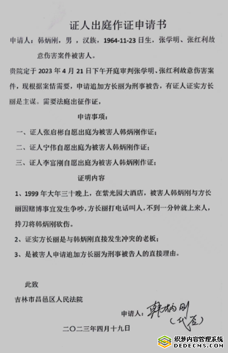 2023年4月19日,韩炳刚再一次向法院递交申请书,申请当年在赌博现场目睹他被致伤整个过程的三个证人出庭。