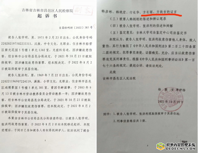 2022年 10月20日,吉林市昌邑区人民检察院向昌邑区人民法院作出吉昌检刑诉【2022】385号起诉书,起诉书称:“本院认为,被告人张学明、张洪利故意伤害他人身体,致人重伤,其行为触犯了《中华人民共和国刑事诉讼法》第二百三十四条第二款的规定,犯罪事实清楚,证据确凿、充分,应当以故意伤害罪追究其刑事责任。”