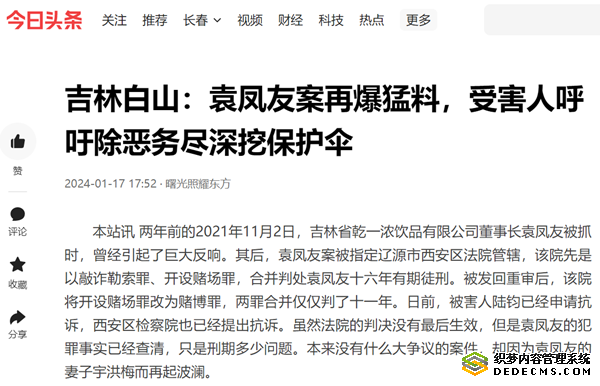 本站讯 两年前的2021年11月2日,吉林省乾一浓饮品有限公司董事长袁凤友被抓时,曾经引起了巨大反响。其后,袁凤友案被指定辽源市西安区法院管辖,该院先是以敲诈勒索罪、开设赌场罪,合并判处袁凤友十六年有期徒刑。被发回重审后,该院将开设赌场罪改为赌博罪,两罪合并仅仅判了十一年。日前,被害人陆钧已经申请抗诉,西安区检察院也已经提出抗诉。虽然法院的判决没有最后生效,但是袁凤友的犯罪事实已经查清,只是刑期多少问题。本来没有什么大争议的案件,却因为袁凤友的妻子宇洪梅而再起波澜。