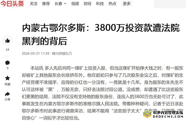 本站讯 多人先后向同一煤矿上投资入股,但当这煤矿开始挣大钱之时,有一股东却被矿上其他股东合伙排挤在外。他在起初只参与了几次股东会议之后,对煤矿的生产经营便不准插手,应得的分红也一分没有,一晃就是十几年。身为股东的朱先生不认可这样被“黑”,万般无奈,只好去法院讨回公道。没成想,却遭遇了比这些股东们更黑的结局,法院不仅没有支持他的股东身份,连投入的3800万也无处可讨了,此事就发生在内蒙古鄂尔多斯市的准格尔旗人民法院。带着种种疑问,记者于近日亲赴鄂尔多斯市对此事进行调查采访,结果不能用“法官胆子太大”来形容,只能用“触目惊心”一词似乎才比较恰当。