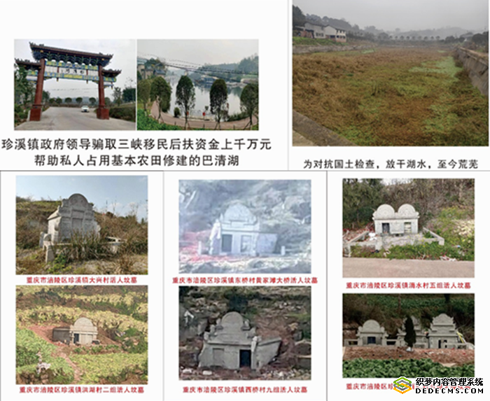 接到投诉后,记者前往重庆市涪陵区珍溪镇中峰社区,走访了当地村民。村民们说:书记镇长新官不管旧事,包庇纵容不交水费的其他村干部,不主持公道正义,还骗取国家三峡移民后扶资金,帮助私人借用国家项目资金几千万打造珍溪镇百汇巴清湖并非法占用上百亩永久基本农田,为应付上级检查,将占用的基本农田用绿色植物覆盖,湖水放干,现场至今可见。