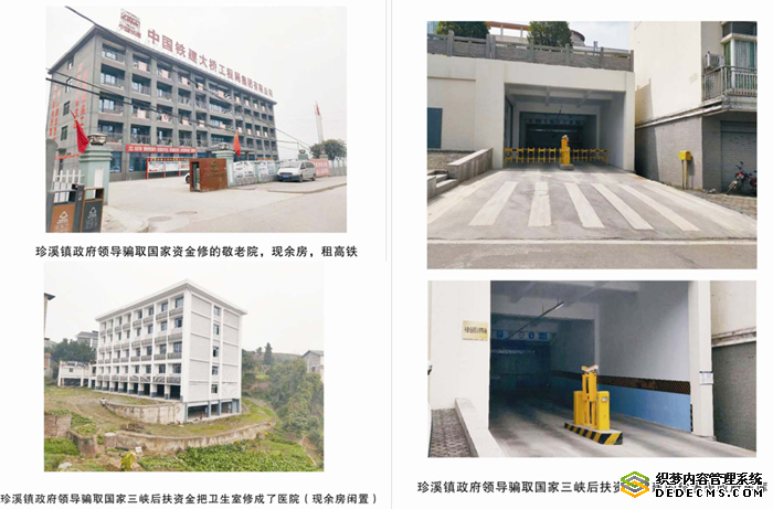 村民们还说:镇领导修建豪华政府办公楼和车库,修建闲置敬老院和卫生院,对抗上级组织检查,造假,将豪华办公楼和车库挂社区招牌对抗组织排査,巧立名目骗取国家项目资金。镇党委书记邱国光如此作风,竟然被提拔为涪陵区生态环境局局长,镇长石以超被提拔为镇党委书记。这些人形式主义、官僚主义、两面人,现任镇党委书记石以超擅自篡改信访材料、诉求,敷衍塞责。之前,珍溪镇政府就出具虚假文件,区政府发改委文件尚未下达,实施文件就提前签发,推诿卸责扯皮,债务让村委承担,严重违背党性原则。镇政府对鞠廷龙垫资修建民生工程建设款1000多万元拒绝支付, 并在鞠廷龙讨要时无任何理由直接罢免其中峰社区党支部书记,不听民意、独断专行,利用领导权力以权压法、逐利违法、随心所欲,报送黑材料使社区书记鞠廷龙被关押15天。目前,鞠廷龙已申请国家赔偿,公安机关已经纠错。现在,鞠廷龙要求聘请第三方机构评估其垫资建设道路等民生工程量,并支付他垫资的成本工程款。鞠廷龙已向中纪委、国家信访局、全国人大、全国政协等单位控告投诉,并已收到信访回执。