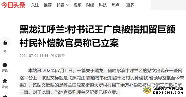 本站讯 2024年7月1 日,一篇关于黑龙江省哈尔滨市呼兰区的贴文出现在一些网络平台上,该贴文标题是《黑龙江:霸道村书记扣留千万村民补偿款 省领导签批至今未果》,该贴文反映的是呼兰区沈家街道大罗村村民千余万补偿款被村书记王广良扣留一事。对于此事,当地官员称呼兰区纪委已经立案。