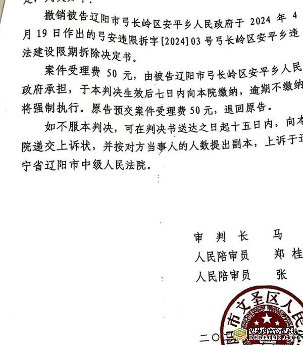 赵树郡说,他之所以不在补偿协议上签字,是因为这补偿价格实在是太离谱,按照当地同样地区的补偿,连一半都不到,政府在打造旅游区的规划中,这部分补偿是给划拨了不小的数目,可到了乡及区政府这里,却给扣下了,就是不给百姓,不同意就强迁。他始终认为,在这个国家,肯定有说理的地方,于是在强迁后,他将乡政府告上法庭。2024年8月,辽阳市文圣区法院下达判决,判定这次强迁属违法强迁。对方还不服,上诉到了辽阳市中级法院,这家法院当然理直气壮地维持了原判。