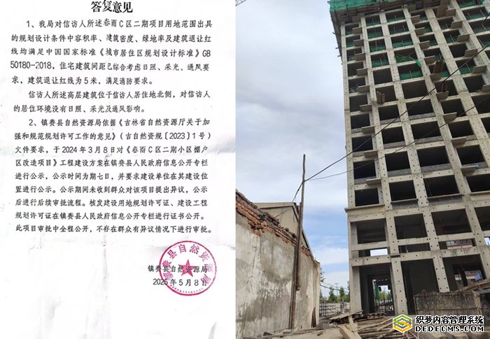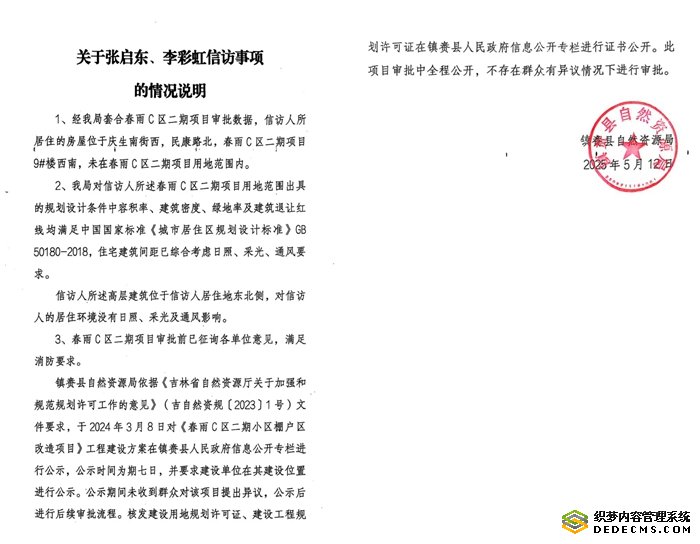 面对争议,镇赉县相关部门作出了回应。镇赉县自然资源局于 2025年5月12日发布情况说明,称信访人所居住房屋不在春雨 C 区二期项目用地范围内,项目的容积率、建筑密度等规划设计条件满足国家标准,住宅建筑间距已综合考虑日照、采光、通风要求,不存在对信访人居住环境的影响,且项目审批前已征询各单位意见、进行公示,公示期间未收到群众异议,后续审批流程规范,全程公开,不存在群众有异议情况下进行审批的情况 。