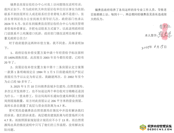 然而,被拆迁人张启东对政府部门的回应提出了强烈质疑。张启东指出镇赉县房屋征收经办中心称联系不到他是借口,自己曾多次前往征收办公室并留下联系方式,政府部门的情况说明自相矛盾,缺乏公信力。对于补偿方案,他认为自家房屋经营已满20 年,应按规定获得标注面积140%调换房屋的补偿;房屋自2002 年翻建至今已50 多年,应认定为有证房。此外,他强调双方现场测量高层与营业房距离为4.7米,远小于按国家规划设计规范应有的13米,而自然资源局的情况说明未解决这一实际问题。在他看来,政府部门工作人员专业能力不足,导致问题频出,百姓频频上访,不仅损害了居民权益,也给地方带来诸多不稳定因素。