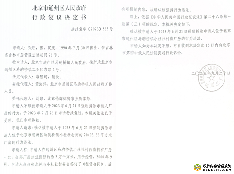 2023年9月20日,通州区人民政府针对马驹桥政府违法暴力拆迁行为作出复议决定,马驹桥人民政府强拆行为违法。