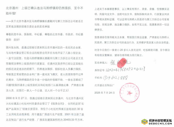 我叫张永纯,是通过招商引资来到北京市通州区的一名农民企业家,与当地村委会签订有合法的租赁合同并在当地开设了几家小型企业,一直守法经营。但是马驹桥镇镇长唐殿珂与第三方拆迁公司老总王克军藐视法律和上级政府的行政复议,在通州区政府早已经认定其做出的拆迁决定违法的前提下,仍然违法强拆、组织社会人员暴力强拆,导致我正常经营的企业和厂房一夜间灰飞烟灭,老人因受到惊吓过早的离世,马驹桥镇政府至今连一分钱的补偿都不给,一家生活都成了问题!我强烈请求上级党政机关和纪检部门认真调查此事,严肃查出案涉人员,还我们一家人一个公道,还人间一个公平正义!