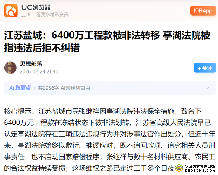 “我并非缠访闹访人员,所有诉求均于法有据;我更非无理取闹,只是穷尽司法途径后,求告无门、走投无路。”张继祥表示,6400万元工程款的背后,是材料商的货款、农民工的工资,是几十个家庭的生计,亭湖法院的长期拖延,不仅让他的家庭陷入绝境,更埋下了社会稳定隐患。