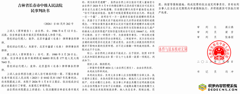 本站讯 2026年春节刚过,吉林省长春市人由自然就向吉林省高级法院提起再审申请,原因是在与孙可的被继承人债务清偿纠纷一案,由自然不服长春市南关区法院(2025)吉0102民初1567号民事判决及长春市中级法院(2026)吉01民终262号民事判决,其再审申请核心直指原审程序严重违法,关键证人未出庭接受质证、法官私自调取证言并直接作为定案依据等问题。同时,由自然已向相关部门提交举报材料,指控审理该案的长春市南关区法院邓翔匀法官在案件办理中滥用职权、枉法裁判,漠视当事人合法诉讼权利。
