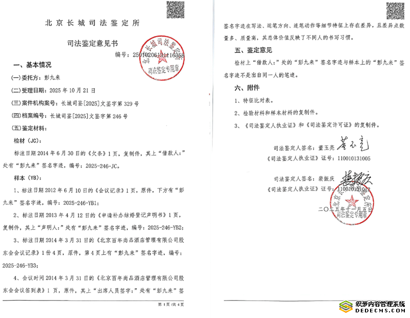 2025年11月,第二次北京司法鉴定机构的鉴定结果还是显示所谓“彭九来”签名的借条和样本上的签名“两者不是出自同一人笔迹”