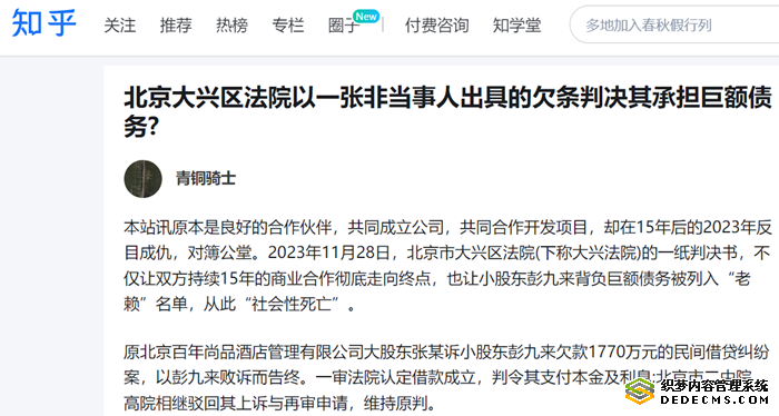 本站讯原本是良好的合作伙伴,共同成立公司,共同合作开发项目,却在15年后的2023年反目成仇,对簿公堂。2023年11月28日,北京市大兴区法院(下称大兴法院)的一纸判决书,不仅让双方持续15年的商业合作彻底走向终点,也让小股东彭九来背负巨额债务被列入“老赖”名单,从此“社会性死亡”。