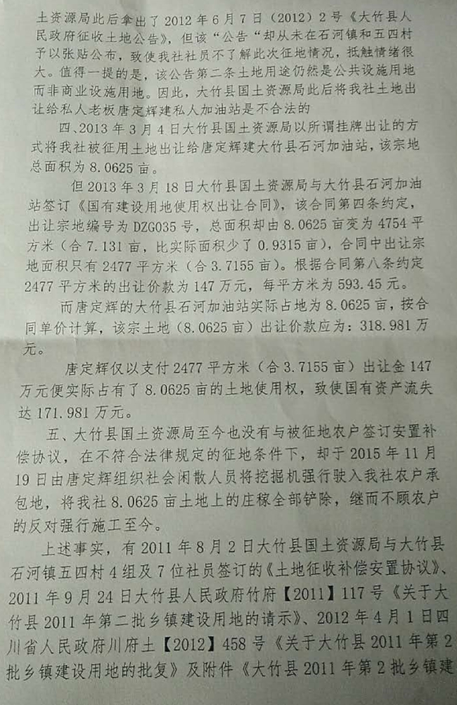 据举报者提供的资料查证: 2011年9月24日,大竹县人民政府向四川省人民政府提请批准用地,拟将大竹县石河镇五四村4组、石桥镇周河村1组等4个乡(镇)、4个村、4个村民小组的农用地2.1628公顷转为建设用地。