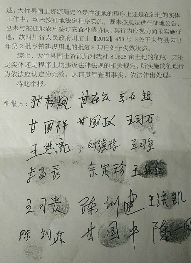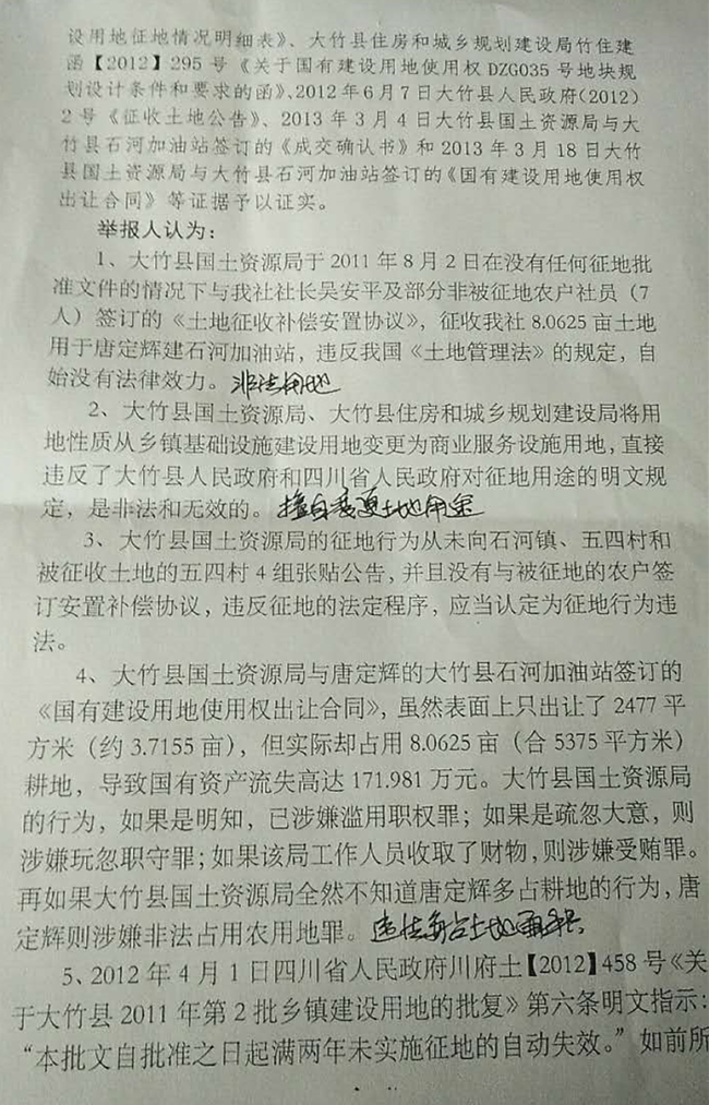 近日,四川省达州市大竹县石河镇五四村4社王习贵等18位村民向有关部门实名举报,大竹县国土资源局违法征用该社土地用于建私营加油站。举报者称:大竹县国土资源局在没有任何征地批准文件的情况下与该社社长吴安平及部分非被拆迁户签订《土地征收补偿安置协议》征收该社土地,严重违反《土地管理法》……
