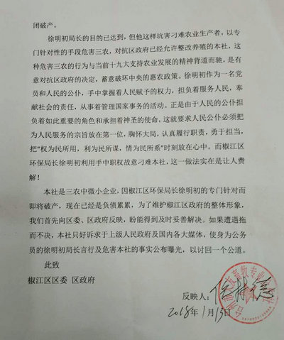 台州市大友畜牧合作社法人倪林德认为,台州市环保局椒江分局局长徐明初的目的已达到,但他这样坑害刁难农业生产者,以专门针对性的手段危害三农,对抗区政府已经允许整改养殖的大友畜牧合作社,这种危害三农的行为与当前十九大支持农业发展的精神背道而驰,是有意对抗区政府的决定,蓄意破坏中央的惠农政策。