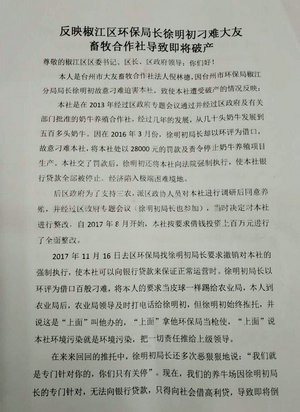 近日,台州市大友畜牧合作社法人倪林德来信反映,因台州市环保局椒江分局局长徐明初故意刁难合作社环评一事,致使遭受濒临破产。