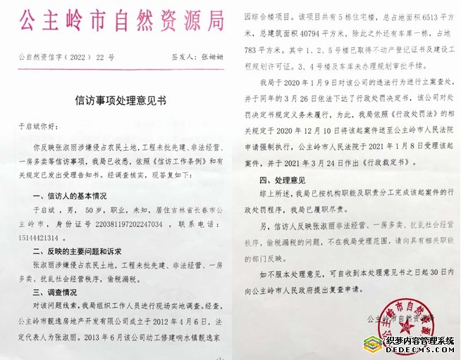 2,《信访事项处理意见书》(公主岭市自然资源局公自然资信字(2022)22号)证明张淑丽开发的靓逸家园3、4号楼及车库未办理规划审批手续。该意见书称:经查,靓逸公司成立于2012年4月6日,法定代表人为张淑丽。2013年6月该公司动工修建响水镇靓逸家园综合楼项目。该项目共有5栋住宅楼,总占地面积6513平方米,总建筑面积40794平方米,除此之外还有车库一栋,占地783平方米。其中1.2、5号楼已取得不动产登记证书及建设工程规划许可证。3、4号楼及车库未办理规划审批手续。我局于2020年1月9日对该公司的违法行为进行立案查处,并于同年的3月26日依法下达了行政处罚决定书,该公司对处罚决定书规定义务未履行,为此,我局依照《行政处罚法》的相关规定于2020年12月10日将该起案件送至公主岭市人民法院申请强制执行,公主岭市人民法院于2021年1月8日受理该起案件,并于2021年3月24日作出《行政裁定书》。