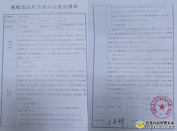 3,国家税务总局长春市税务局第三稽查局的《税收违法行为查办结果反馈单》(编号:2201062020000001)对吉林省靓逸纸业有限公司认定:该企业2013年、2014年,2015年,2016年,2017年,2018年、2019年少缴纳营业税,增值税,城市维护建设税、企业所得税的行为属于《中华人民共和国税收征收管理法》第六十三条第一款“纳税人伪造、变造、隐匿、擅自销毁账薄、记账凭证,或者在账簿上多列支出或者不列、少列收入,或者经税务机关通知申报而拒不申报结果或者进行虚假的纳税中报,不缴或者少缴应纳税款的,是偷税“规定的偷税行为”。“综上,应补缴税费合计2,970,508.70元,罚款合计681,455.62元。”