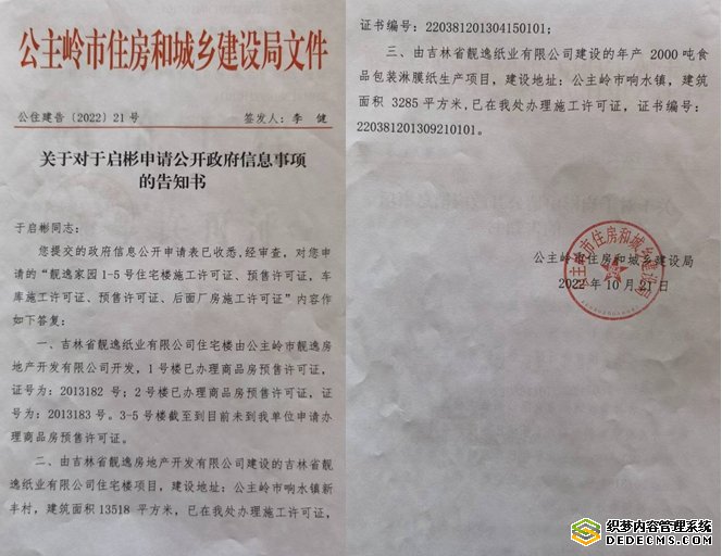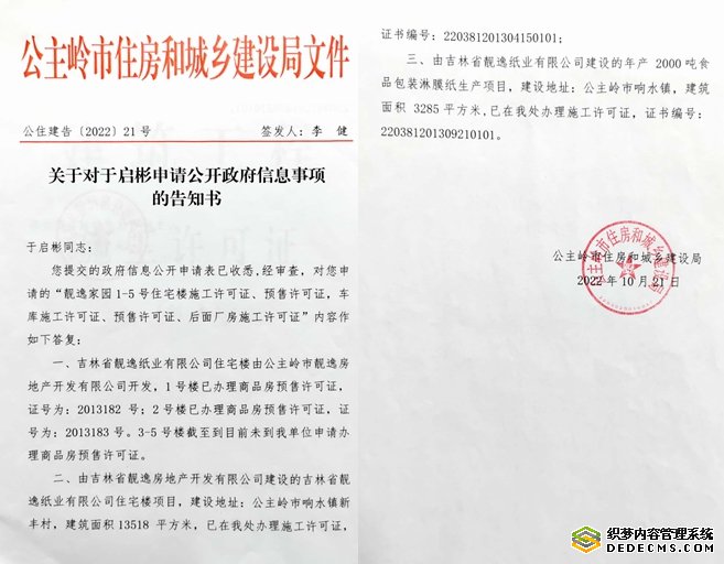3,公主岭市住房和城乡建设局文件(公住建告(2022)21号)证明靓逸家园3-5号楼未办理商品房预售许可证。该文件称:吉林省靓逸纸业有限公司住宅楼由靓逸公司开发,1号楼已办理商品房预售许可证,证号为:2013182号;2号楼已办理商品房预售许可证,证号为:2013183号。3-5号楼截至到目前未到我单位申请办理商品房预售许可证。