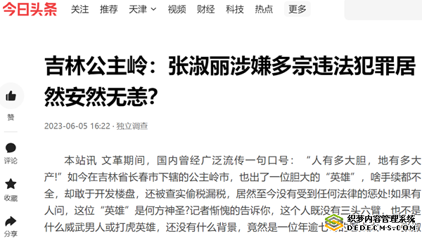 依法治国的大背景之下,堂堂的一级政府居然拿她一个老太太毫无办法?我们不明白,也不能理解的是,这个张淑丽到底有多硬的后台、靠山?公主岭市的相关部门是怎样监管的?监管部门是否涉嫌不作为、不担当等渎职犯罪?这个女人到底有什么本事能在涉嫌多宗违法甚至犯罪后仍能安然无恙?从即日起,我们将连续进行调查报道。(晓明)