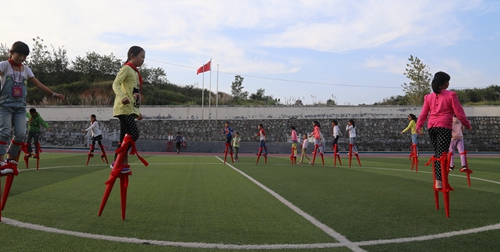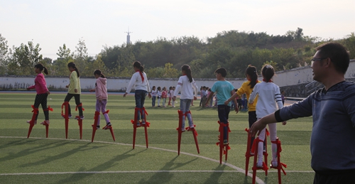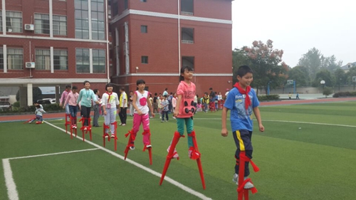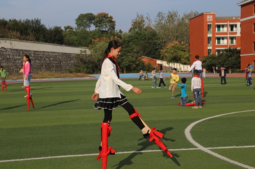 学生在高跷上自由行走