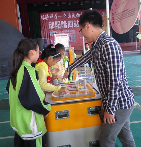 本站讯 11月2日,隆回县九龙学校的体艺馆里格外热闹,中国流动科技馆湖南巡展隆回站就设在这里。流动科技馆走进九龙校园,“无弦琴”、“椎体倒转”、“人体导电”等新颖的科普展品让同学们既大饱眼福,又体验了科学带来的无穷乐趣。