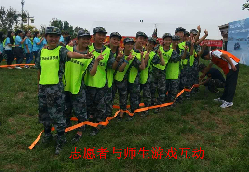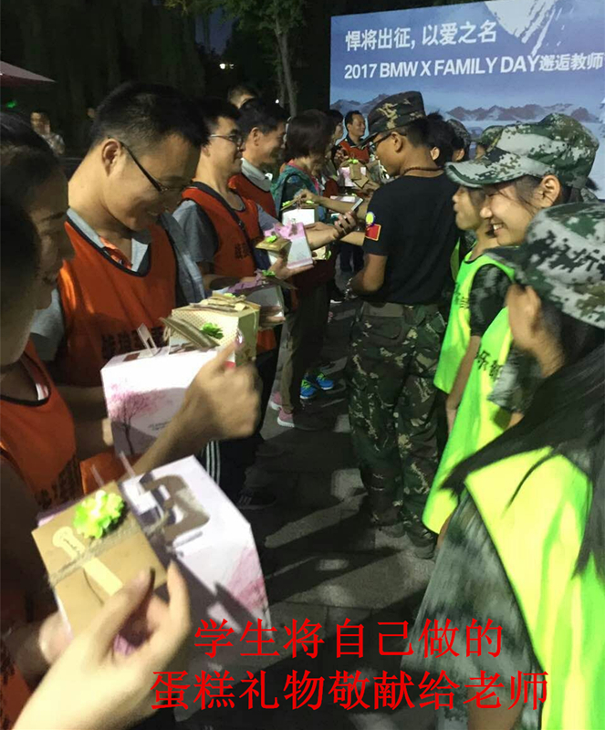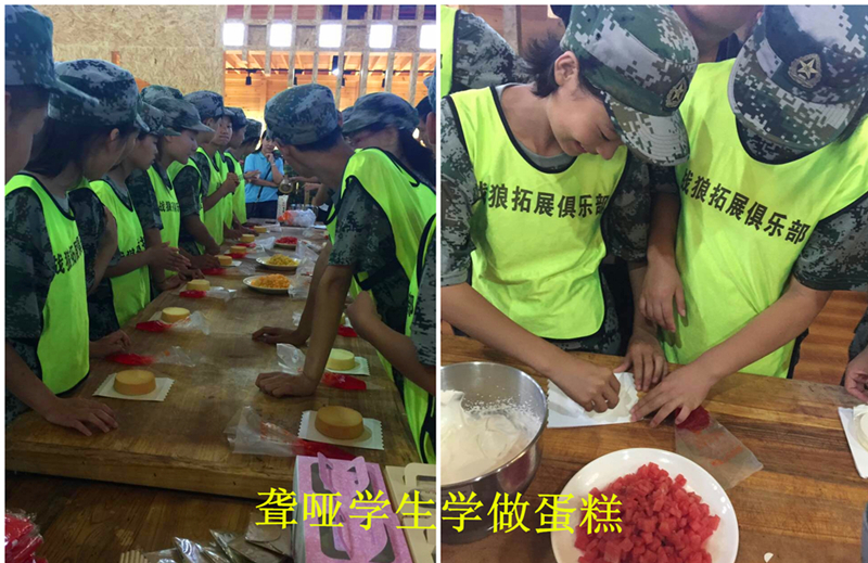 在共庆教师节活动中,志愿者与聋哑学校师生在战狼俱乐部教官和手语老师的讲解下展开了多个互动节目,聋哑学生自己动手搭帐篷、做蛋糕等。