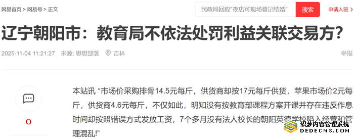 本站讯 “市场价采购排骨14.5元每斤,供货商却按17元每斤供货,苹果市场价2元每斤,供货商4.6元每斤,不仅如此,明知没有按教育部课程方案开课并存在违反作息时间却按照错误方式发放工资,7个多月没有法人校长的朝阳英德学校陷入经营和管理混乱!”