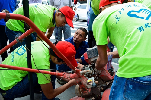 机械与电气工程学院青年志愿者服务团来到涪陵区马武镇开展暑期“三下乡”科技支农活动。志愿者们对已坏的农耕机器进行询问后开始对各个零件进行清理检查,并对已坏的零件进行修理。有的村民离场镇比较远,不便把已坏机器带到马武镇摆点处,志愿者们就组织人员带上设备翻过一个个的山头前往村民家里进行义务维修。