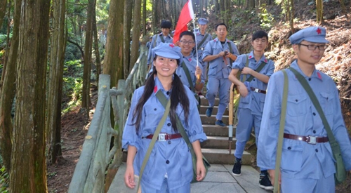 本站讯 穿着红军装,挎着汉阳造,唱着红军歌,自制红军餐,走在海拔一千三百多米的朱毛挑粮小道上,重温毛主席的《西江月·井冈山》,瞻仰黄洋界保卫战胜利纪念 碑,感受八角楼里“工农武装割据”的政治判断……8月5日,在全国青少年井冈山革命传统教育基地举办的“井冈情·中国梦”全国大学生暑期实践季专项行动第 五期学习实践活动中,江苏科技大学“红帆”实践团的20名大学生被改编为第29团第8连3班、4班,变身“红军战士”,真切体验感悟井冈山革命精神。