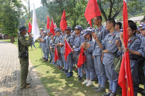 重走挑粮小道,感受革命艰难挑粮小道山路崎岖、陡峭,路面布满岩石,宽度不足一米,战士们走在挑粮小道上,不到20分钟衣服早已湿透。“红米饭那个南瓜汤啰嘿啰嘿,挖野菜那个也当粮 啰嘿啰嘿,毛委员和我们在一起啰嘿啰嘿,餐餐味道香味道香啰嘿啰嘿”,战士们唱起了《红米饭,南瓜汤》,嘹亮的红军歌声在井冈山回荡,鼓舞着大学生“红军 战士”的斗志。女战士背着枪,走不动了,男战士接过枪,不掉队。气喘吁吁的3班班长李彦男表示,爬完山道,身体特别累,深切感受到当年红军战士们挑粮的艰 苦与革命意志的坚定,更感受到井冈山革命时期毛泽东、朱德与战士同甘共苦的精神。4班的班长佟威说:“我们只是背了一个包、一把枪,走在挑粮小道上就已经 是步履蹒跚,可想当年红军战士挑粮时是多么艰难,他们的革命精神让我们肃然起敬。”