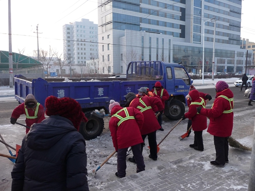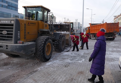 在扎兰屯市新桥大街上,翻斗车、装载机来来往往,600余名环卫工人手拿铁锹、扫帚等清扫工具,冒着零下20多度的严寒,热火朝天的清理道路两侧的积雪。 扎兰屯市地区今年雪量偏大,进入冬季已经降下三场大雪,城管系统在每次降雪雪停后,立即调动大型清雪设备,在城管执法人员和环卫工人的强力配合下,第一时 间清除市区主要道路上的积雪,以确保城市道路整洁、畅通、安全。为尽快把堆积在道路两侧的积雪清运出城,每次降雪后,该市环卫处就合理调配作业设备,在保 障每日生活垃圾清运外,环卫工人每天天不亮即来到清雪一线,加班加点,连夜作业,放弃节假日、休息日,在最短时间内清除市区积雪,还扎兰小城干净整洁、和 谐靓丽原貌。用义务劳动的形式迎接新年的到来,该市环卫干部职工们已坚持了8年。