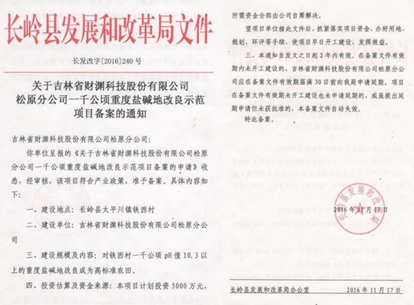 据赵渊介绍:1995年,赵渊在长岭县太平川镇铁西村鑫盆甸投资700万元承包了2000公顷重度盐碱地进行改良(有村镇签署的承包合同),盐碱地改良当年改良当年收获。