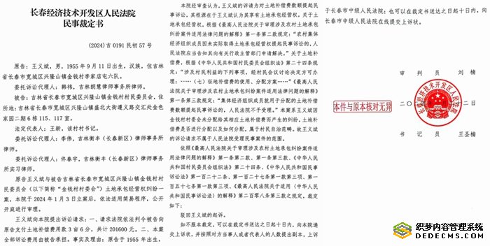 为了维护自己的合法权益,王义斌曾选择通过法律途径维权,但是长春经济技术开发区法院做出的(2024)吉0191民初57号民事裁定书驳回了他的诉讼请求。该裁定书记载:在法庭上,金钱村村委会辩称:一、原告的诉讼请求没有法律及事实依据;原告是金钱村六社村民,1983年生产队包干到户,当时的政策是不参加生产劳动的人员不分地和口粮,要取得口粮和土地需要交一份口粮积累(公益金)和一份土地积累,原告当时只交了一份口粮积累,每人获得520斤粮,放弃了土地积累,所以原告在第一轮土地承包时没有分得土地。而1998年二轮土地承包根据国家政策采取的是“延包”,并不是打乱重分。金钱村经民主决议所作出的“菜地不予调整”,顺应国家政策的导向,原告所在地菜田地和大田地没有打乱重分,原告没有分得菜田地和大田地。金钱村六社土地征收补偿款的支付依据是在本村签署土地承包合同并享有土地,按照土地承包合同支付补偿款。原告没有实际取得案涉土地也没有案涉土地承包合同,因此不具备分配案涉土地征收补偿款的资格。