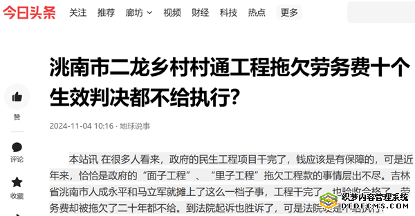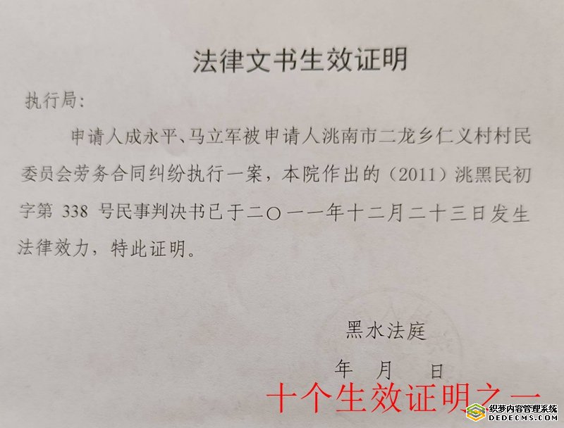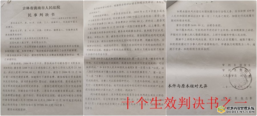 但工程完工后,乡党委书记曲春生和乡长丁立安并没有给结清劳务费,当事人成永平和马立军曾多次去二龙乡政府向曲春生和丁立安讨要无果,无奈之下,他们只好向当地法院提起诉讼。洮南市法院经过开庭审理,先后做出了(2011)洮黑民初字第333号、334号、335号、336号、337号、338号、339号、340号、341号、342号民事判决书,十个判决全部判决成永平和马立军胜诉,判决二龙乡十个村村委会于2004年11月30日竣工当日结清全部劳务合同款项共计43.3万元。令人感到十分牛逼的是,不管是二龙乡政府还是十个村的村委会,开庭时均未到庭,也未对原告的起诉提出异议。如今,十个判决书均已经生效20年之久,但洮南市法院至今未予执行,成永平和马立军赢了官司,却依旧拿不到劳务费,十个判决书已经形同废纸!他们不解,乡政府和村委会不讲诚信就够缺德的了,法律是维护社会公平正义的最后防线,怎么也这样了呢?难道法院仅仅是用如同废纸的判决书应付我们不成?(记者一刀 江枫)