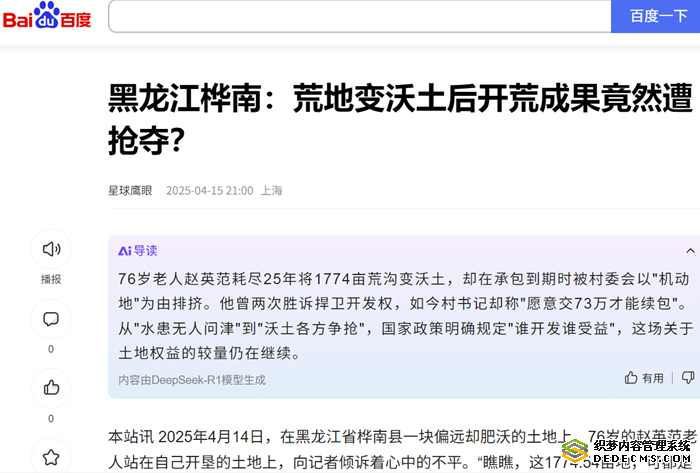 本站讯 2025年4月14日,在黑龙江省桦南县一块偏远却肥沃的土地上,76岁的赵英范老人站在自己开垦的土地上,向记者倾诉着心中的不平。“瞧瞧,这1774.54亩地,可都是我一点点开垦出来的。以前这里常闹水灾,根本没人瞧得上,现在水害治理好了,土地肥沃了,就都想来抢。我开发的是荒地、荒沟,可村书记硬说这是机动地,重新发包时居然把我排除在外,哪有这样的道理?!”虽已年近八旬,老人说起话来依旧底气十足。